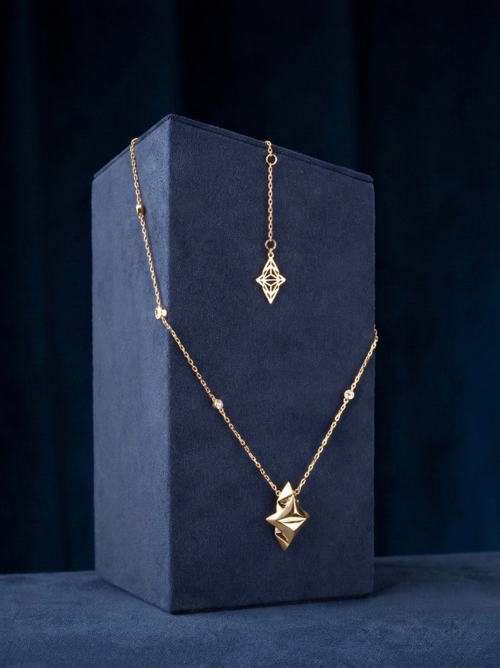 The Athena Celestial Pendant is crafted in 18K gold and suspended from a chain illuminated with 0.56 carats of beveled lab-grown diamonds, scattered like stars along its length. At its center, the house’s signature shield emblem symbolizes strength, wisdom, and protection.