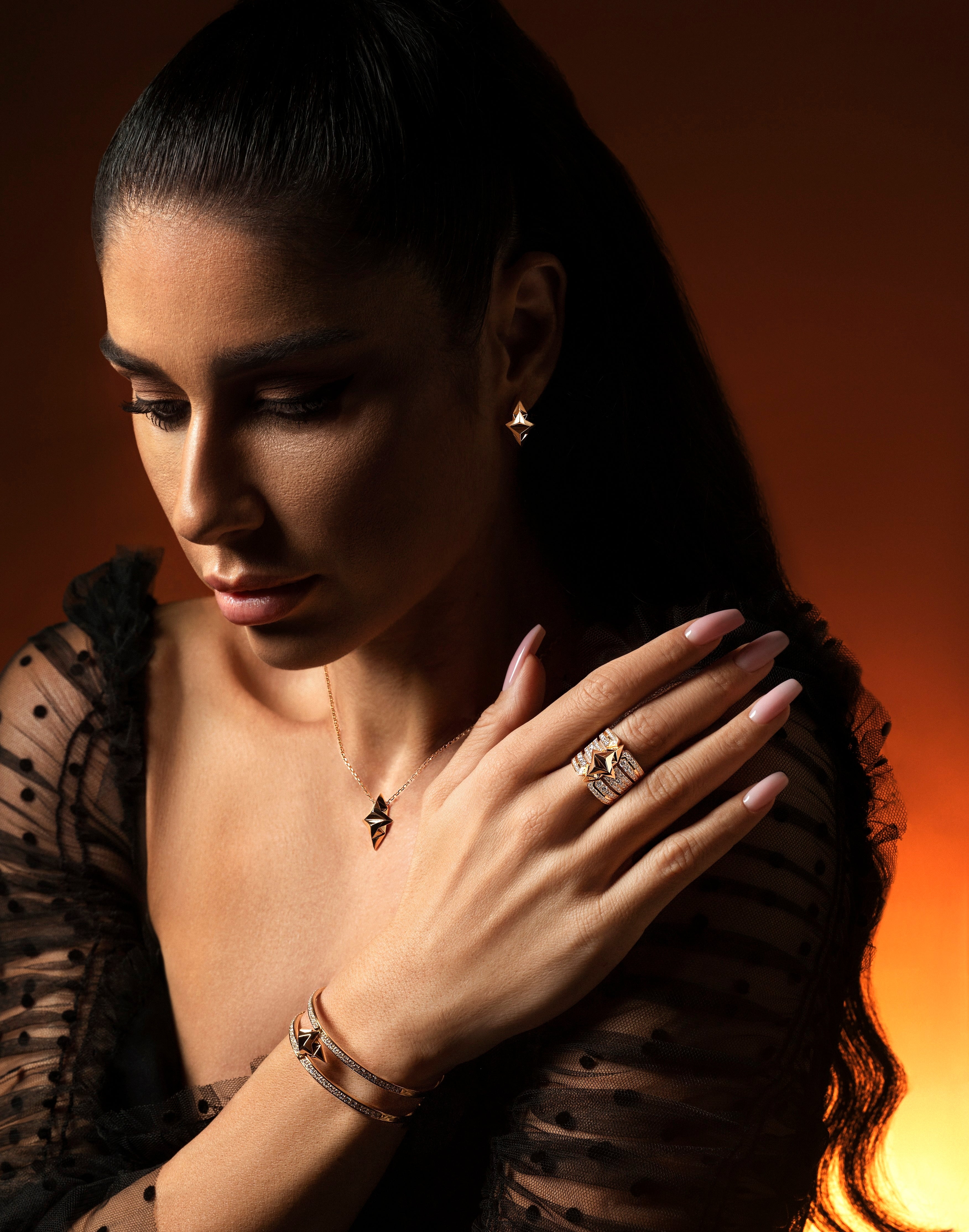 Sculpted in 18K gold, the Athena Stud Earrings feature Sofia Al Asfoor’s iconic shield emblem — a statement of power in its purest form. With their sleek silhouette and radiant finish, they move with you — radiating your light and energy from day to night.