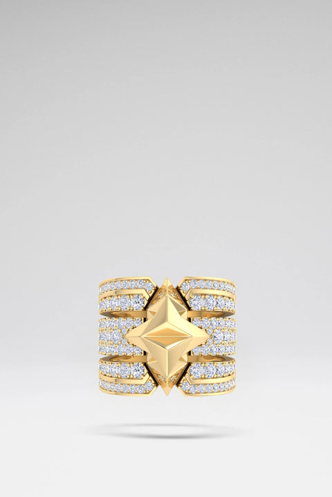 The boldest expression of the Athena spirit, this ring embodies strength in its most powerful form. Handcrafted in 18K gold — yellow, rose, or white — the Athena 100 blazes with 2.13 ct of pavé-set lab-grown diamonds that ignite across its sculptural 20 mm silhouette.