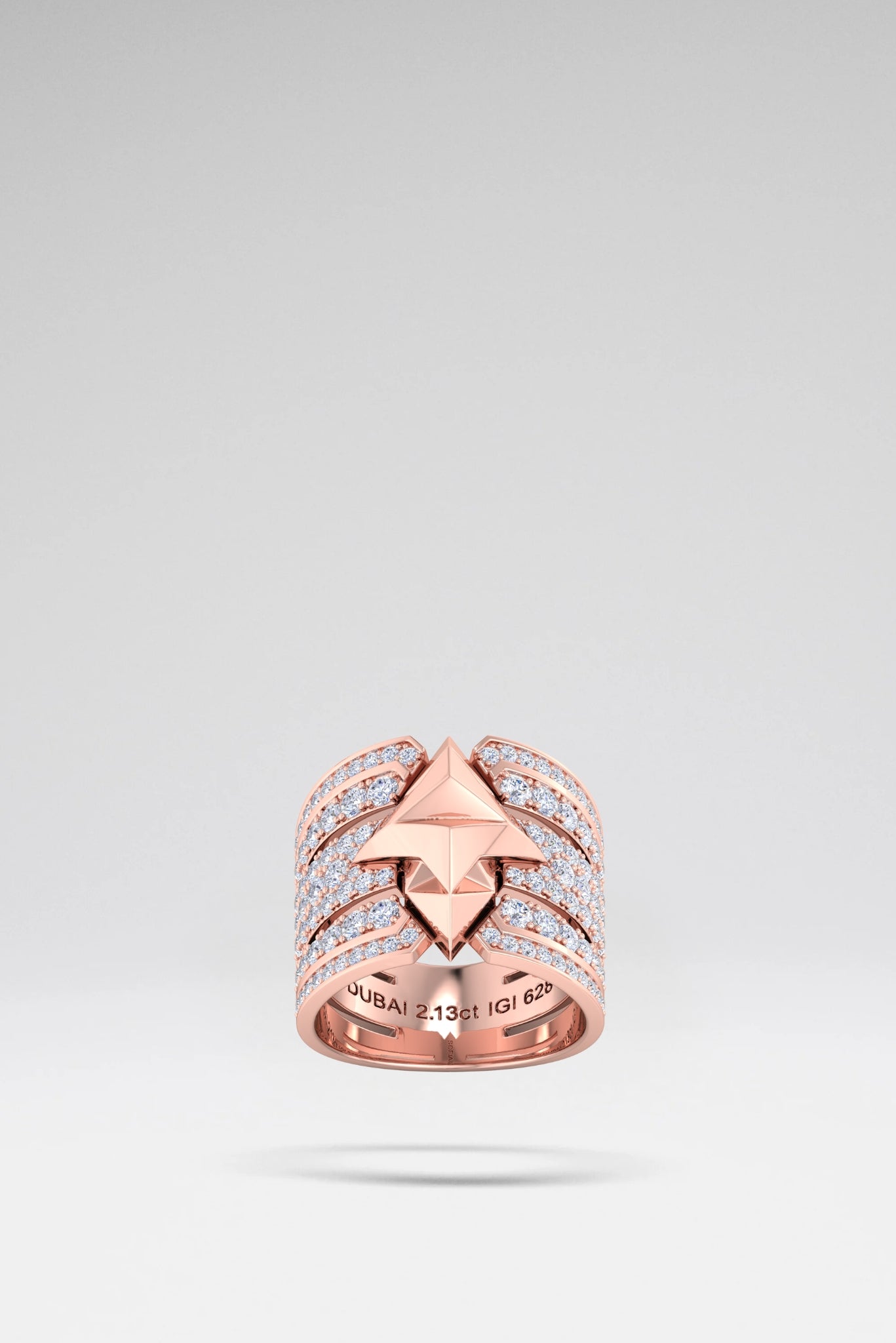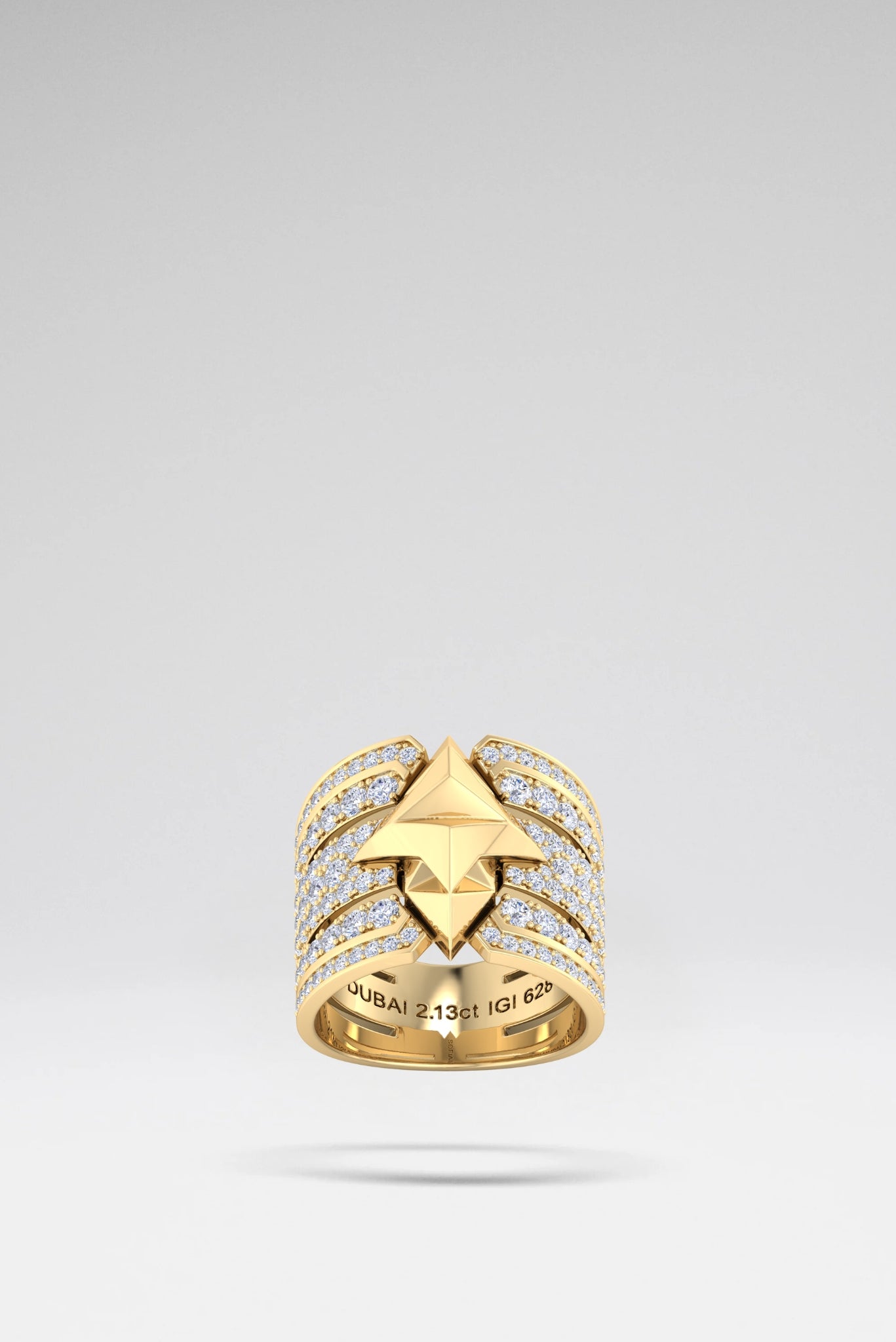The Athena Diamond Shield Ring 50 is a powerful symbol of strength and brilliance. Set with seven rows of 1.35-carat pavé lab diamonds, totaling 17mm, it is crafted in 18K yellow, rose, or white gold. At its heart, Sofia Al Asfoor’s iconic emblem sparkles, embodying the wisdom and strength of the modern goddess.