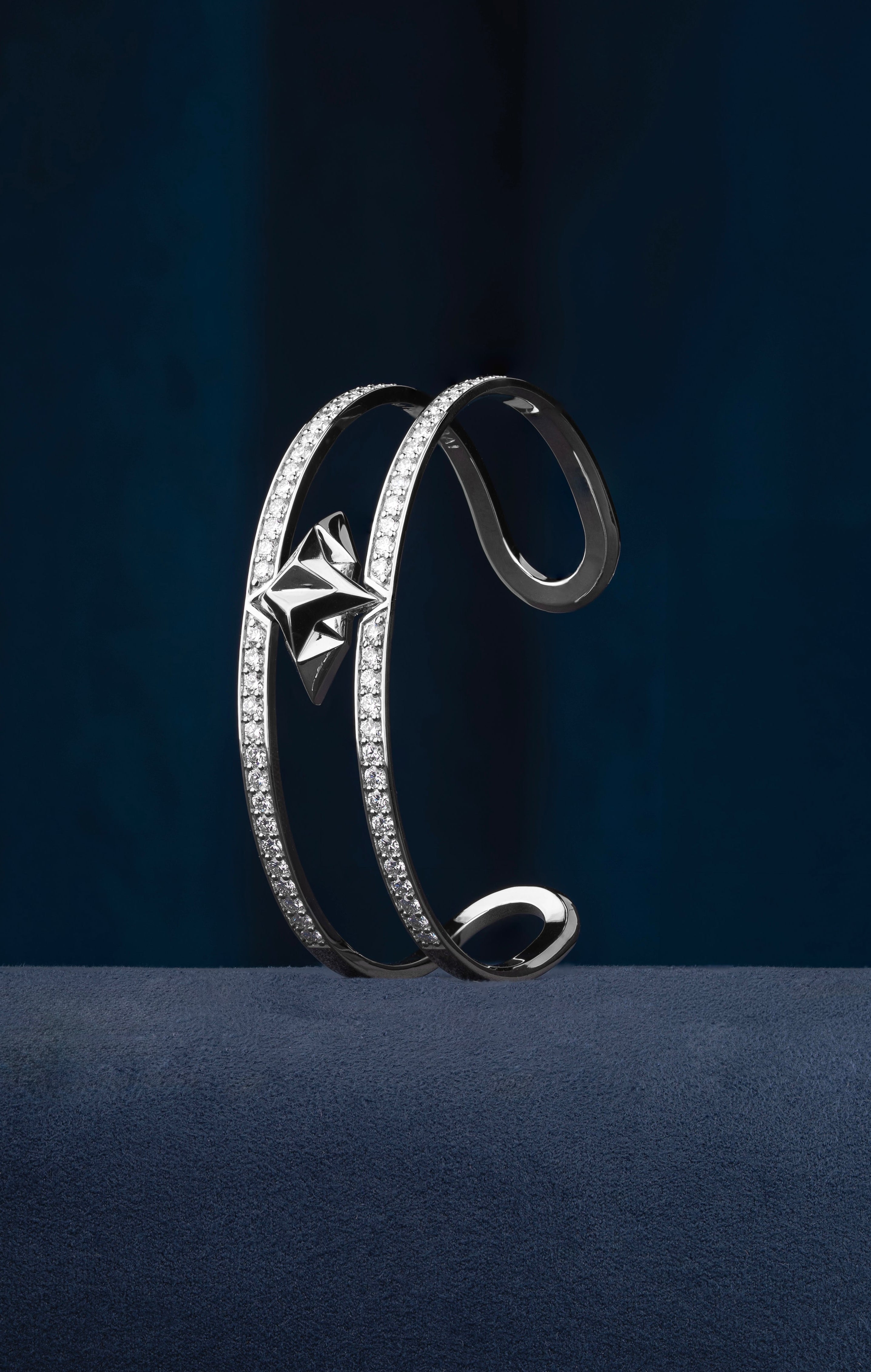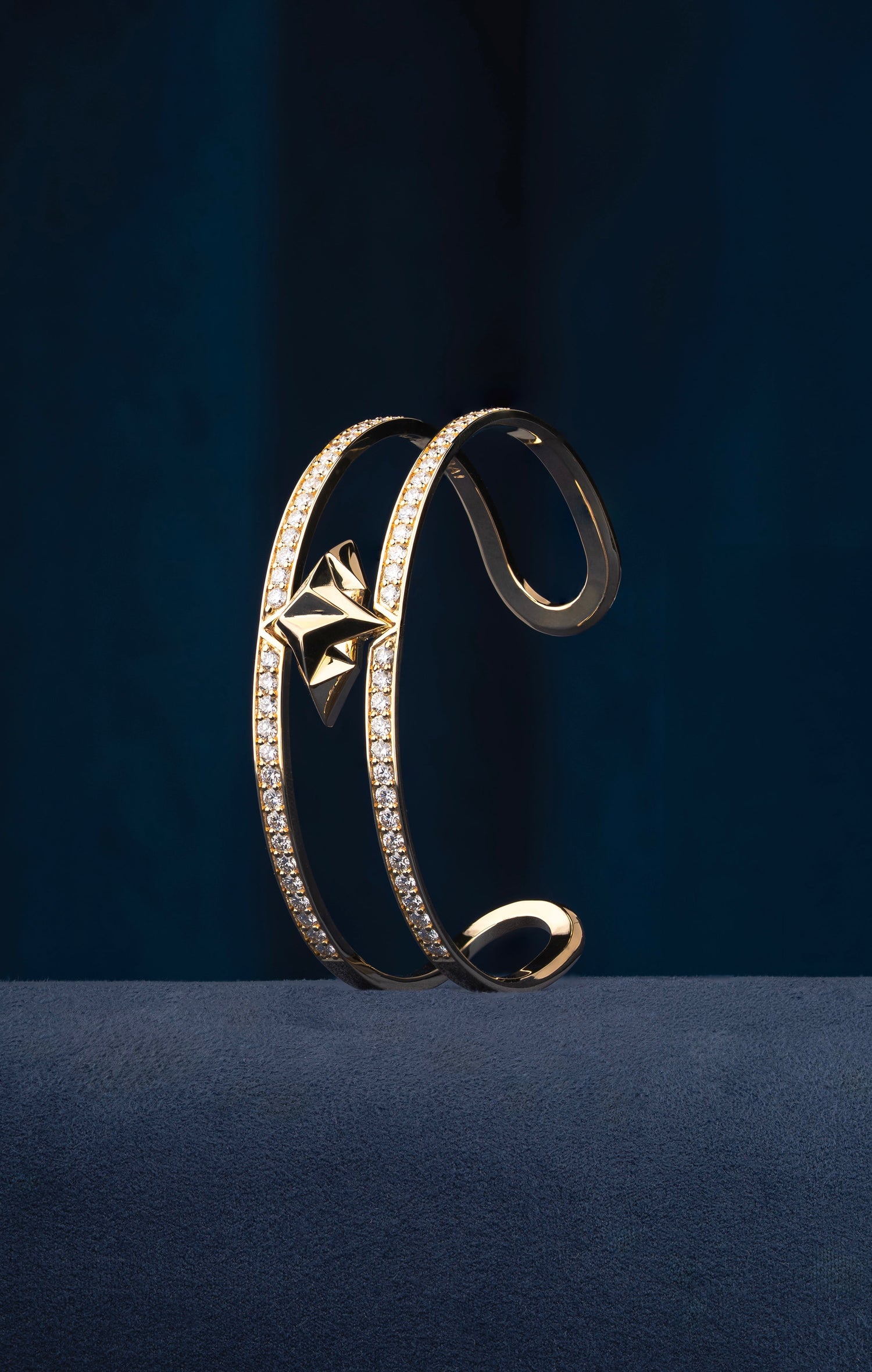 Radiant and architectural, the dual rows amplify the brilliance and presence of the design. Worn alone or layered, the Aura Bangle reflects movement, energy, and the enduring force carried within.